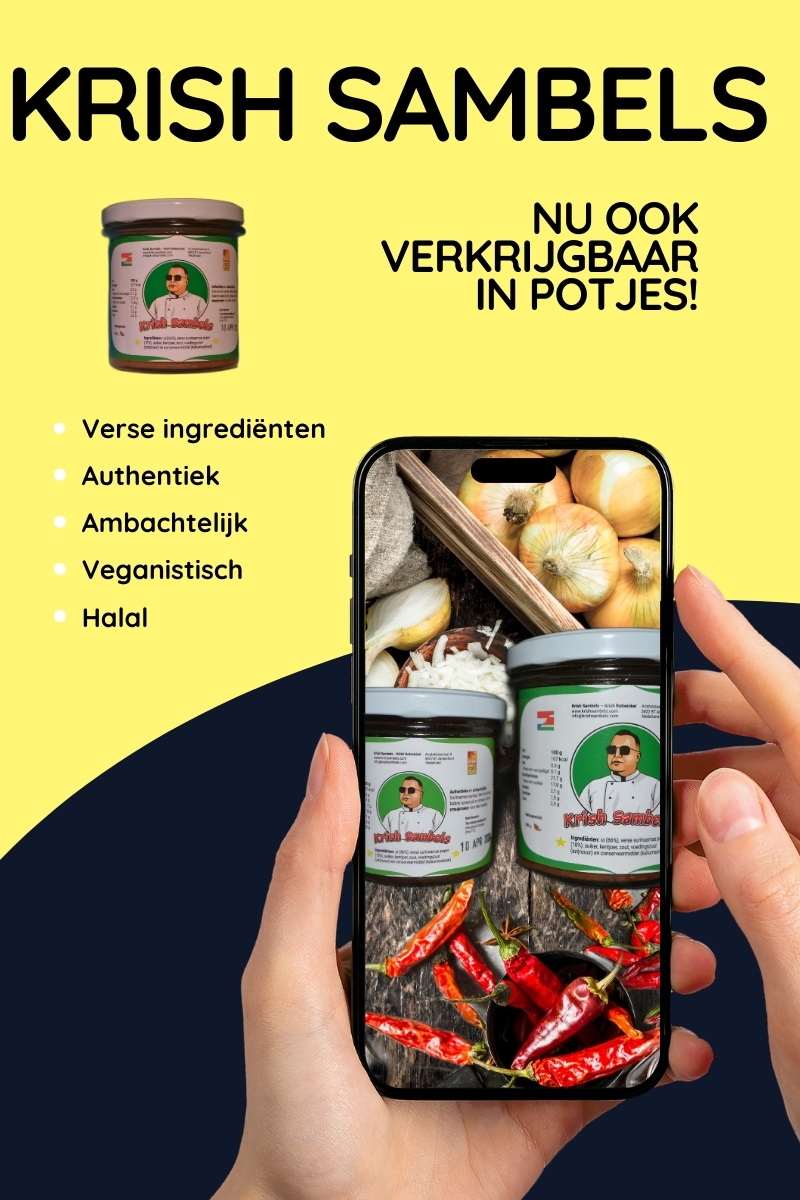 Een van Krish’ meest populaire specialiteiten is de zelfgemaakte sambal. Er is zoveel vraag naar de sambal, die eerst alleen in kleine bakjes verkrijgbaar was, dat Krish heeft besloten om het als apart product te gaan verkopen. Zo is krish sambels ontstaan!